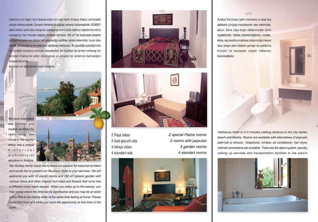Antalya'nın tarihi Kaleiçi Bölgesi'nde bir sessizlik vahası olan Hadrianus, restore edilmiş bir Osmanlı evinde yer alan ve aile tarafından işletilen bir oteldir. Konuklar güzel kokulu bahçelerin ve bazıları spa küvetli olan ayrı ayrı stilize edilmiş odaların keyfini çıkarabilirler.